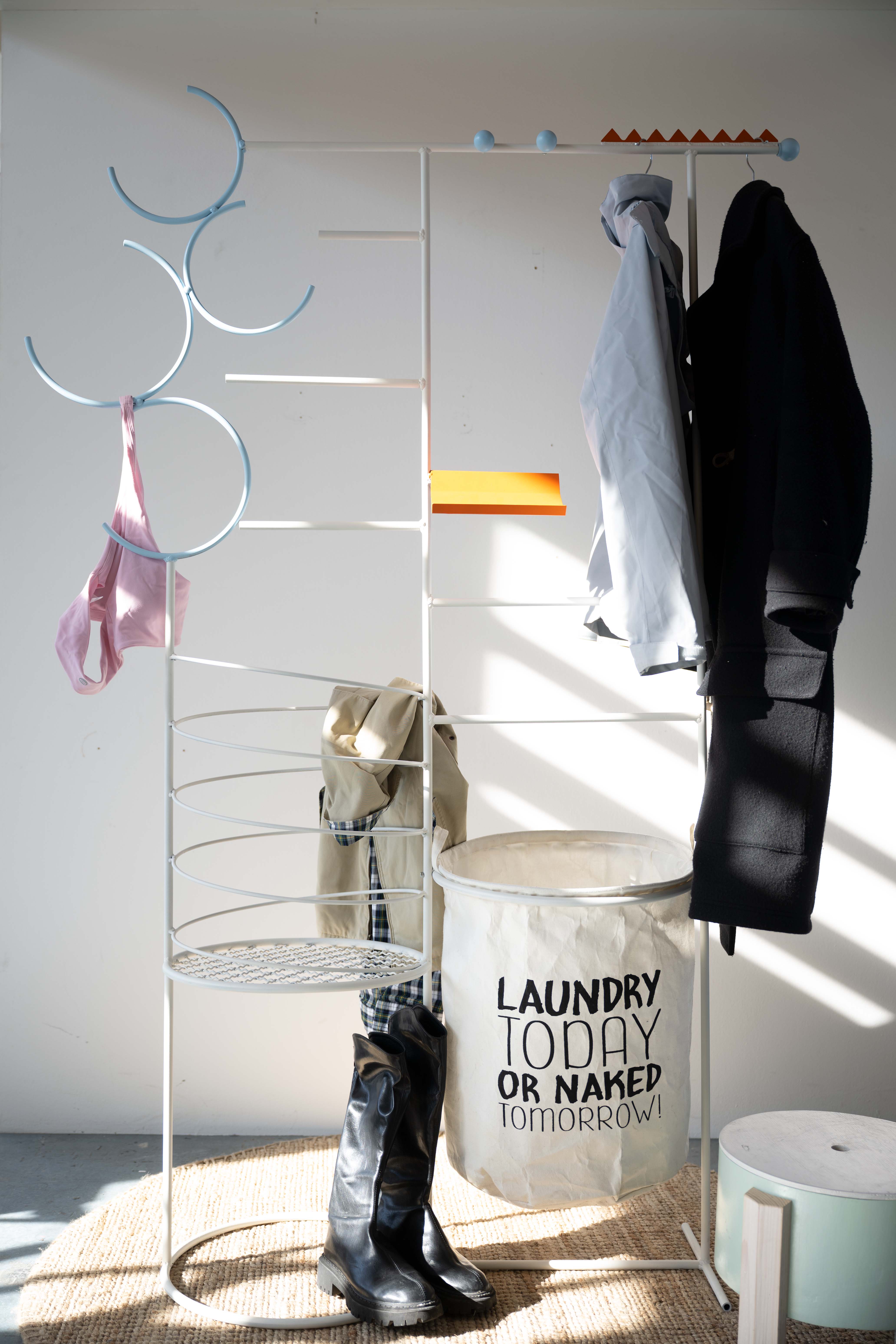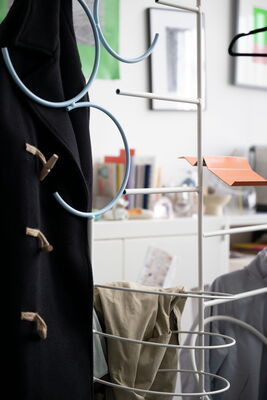 Hano ist ein Aufbewahrungssystem, das das Ablegen und Aufhängen von Kleidung intuitiv und mühelos macht. Es reduziert den Aufwand des Aufräumens und hilft, Ordnung im Alltag zu halten – ohne zusätzliche Anstrengung oder starre Strukturen. Statt einer perfekten Organisation fördert es eine Balance zwischen Ordnung und einer natürlichen, „angemessenen Unordnung“.