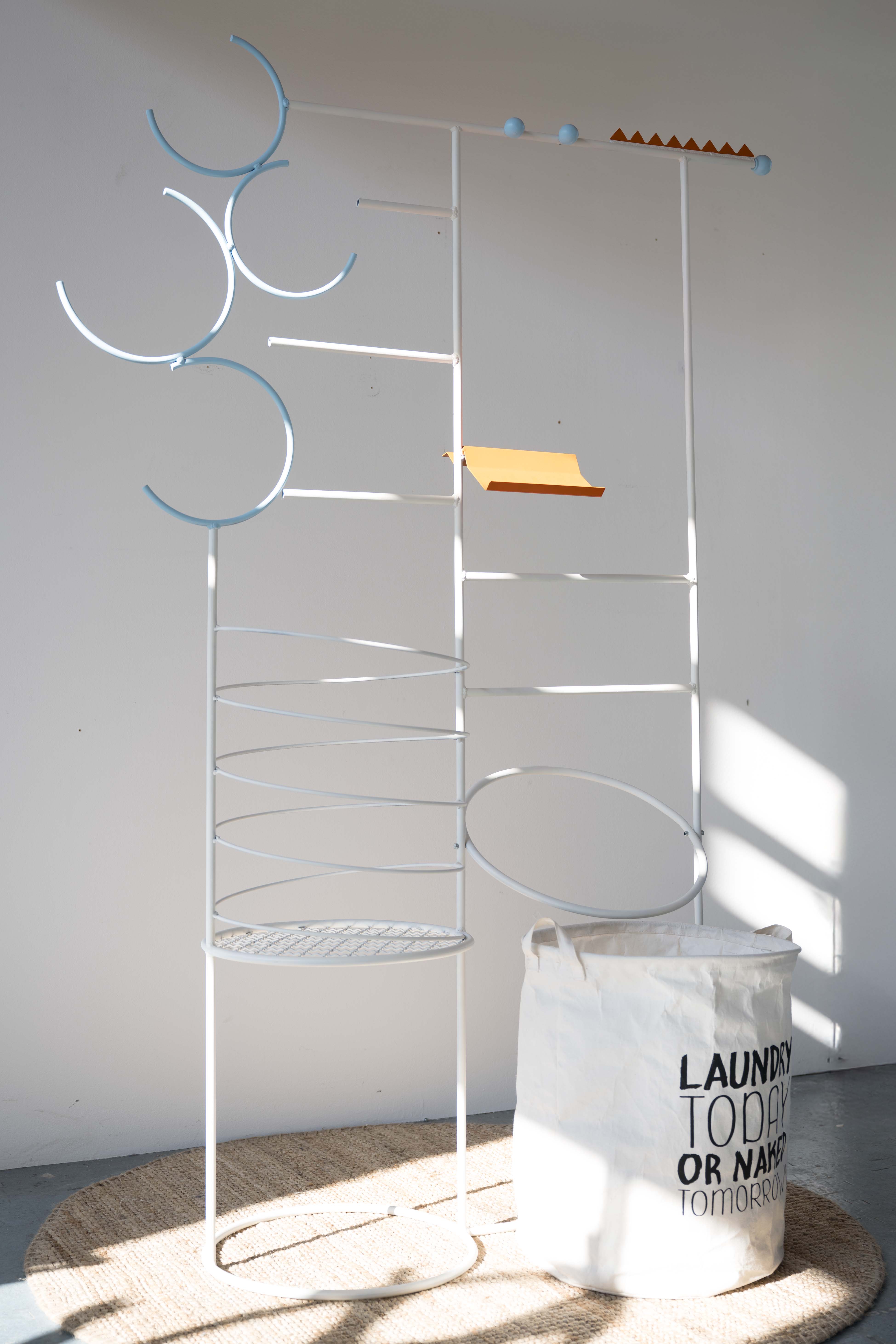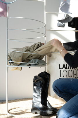 Ein weiteres zentrales Element ist die spiralförmige Ablage, die einen einfachen Zugriff auf Kleidung bietet. Anstatt sich durch einen Stapel wühlen zu müssen, können einzelne Stücke direkt entnommen werden. Gleichzeitig sorgt die offene Konstruktion für eine gute Belüftung, sodass Feuchtigkeit schneller trocknet und Gerüche vermieden werden.