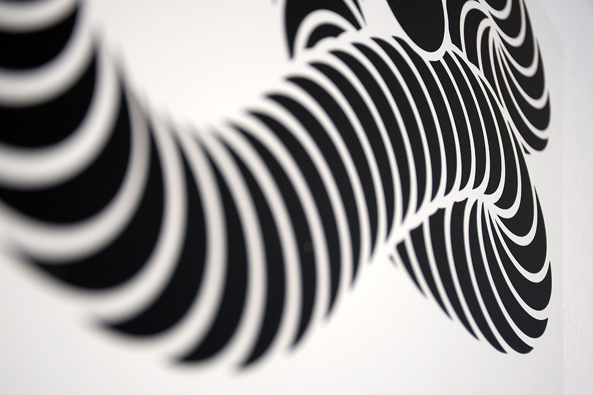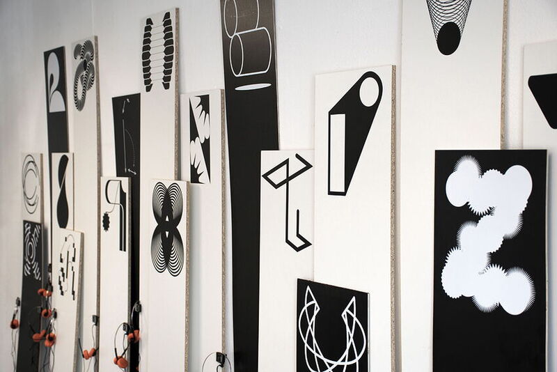 Anfangsbuchstaben teilen. So entstanden teils stark abstrahierte Buchstabenformen, die auf hohen Holzplatten im Raum präsentiert wurden. Um das Erlebnis zu vertiefen, habe