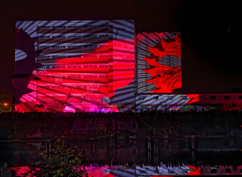 HBKsaar-Studierende des Studiengangs Media Art & Design entwickelten dazu unter der Leitung von Florian Penner-Steinbach, Ingo Wendt und Prof. Daniel Hausig Video-Mapping-Projekte für ein fast 40 Meter hohes Gebäudeensemble im Osthafen. In aufeinander abgestimmten 3D-Visuals mit erzählerischen Komponenten und akustischer Untermalung setzten sich die Projektionen ganz konkret mit dem Ort Osthafen auseinander.