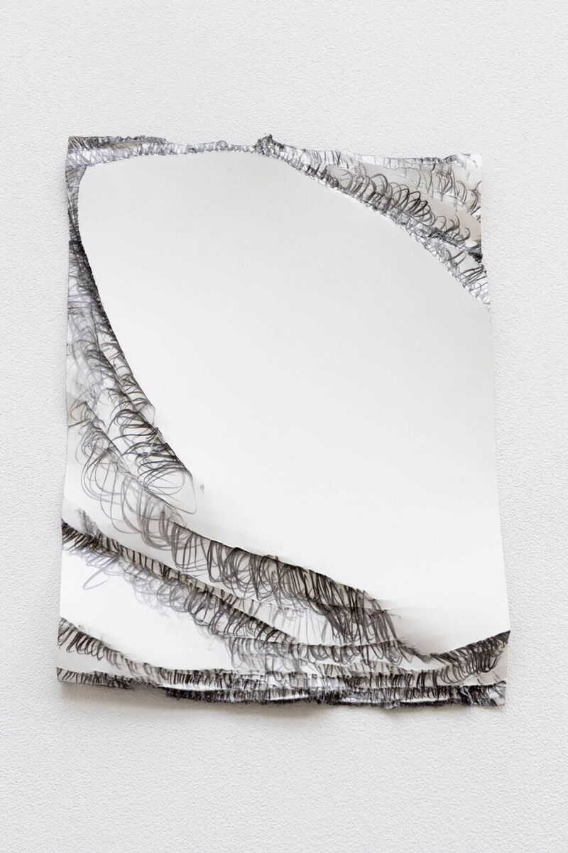 Ich spüre die Beharrlichkeit des Materials, eine direkte Übertragung, es hält dagegen. Ein Bersten, ich reagiere, kontere. Es bilden sich durch zeichnerische Bewegungen streifenartige Flächen. Fast wie Narben, zerknittert, zerfurcht. Inneres drückt sich leicht nach außen, endgültig. Ein unveränderlicher Zustand. Tätowiertes Papier.