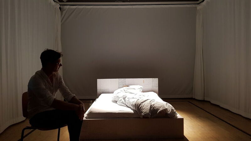 Das Setting wurde von zwei begleiteten Objekten geprägt: Einer selbst genähten Bettwäsche, welche mit den Traumaufzeichnungen bedruckt wurde und ein Bettgestell, welches mit den originalen nächtlichen Mitschriften beklebt wurde.