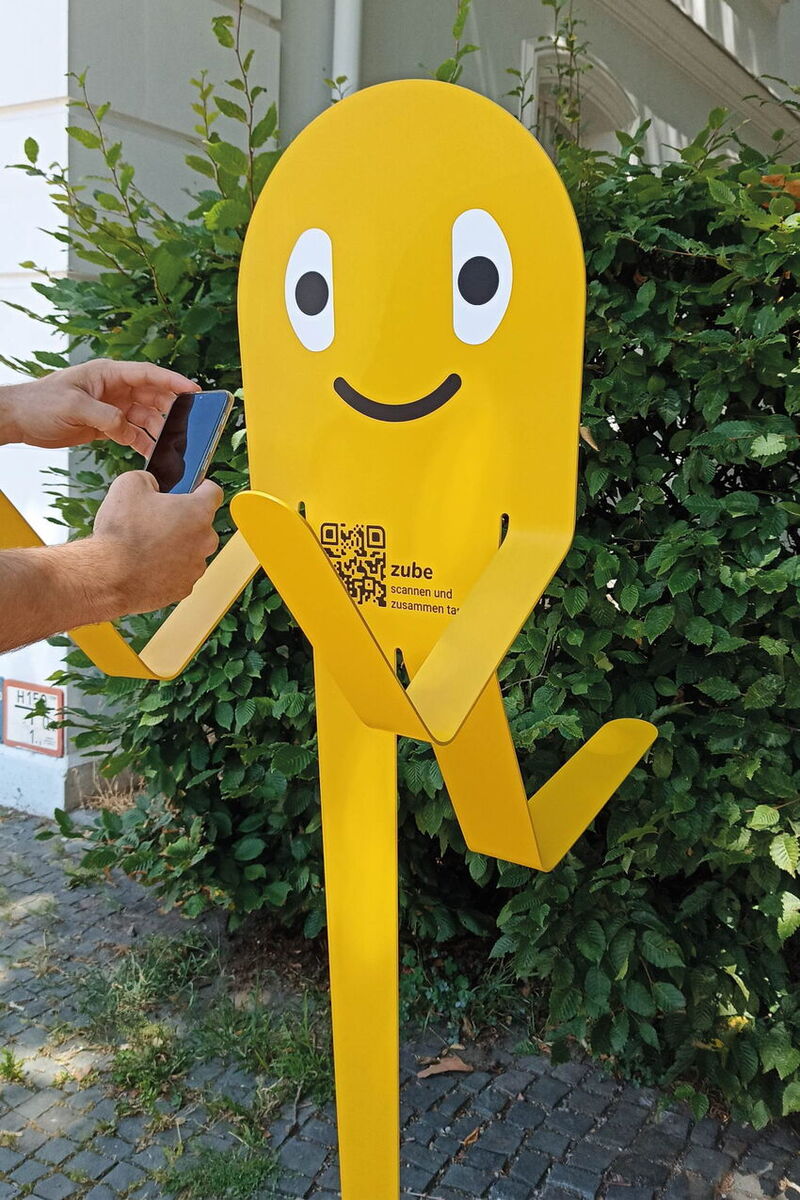 Die App ermöglicht das Suchen und Finden von Bewegungsangeboten in der Nähe und das Kontakteknüpfen mit anderen Bewegungsfreudigen. Im realen Raum machen 3D-Informationstafeln und Sticker auf die verschiedenen Bewegungsmöglichkeiten und das Vernetzen per App aufmerksam. Dazu sind beide analoge Komponenten mit QR-Code und Text versehen, und die gebogenen Informationstafeln stellen verschiedene, zum Ort passende, Bewegungen dar. Gleichzeitig dienen diese Komponenten als Treffpunktmarkierung für App-Nutzer*innen. Nahbare und sympathische Figuren bilden ein zentrales Element von zube, die Zusammengehörigkeit schaffen und die Wiedererkennung erleichtern.