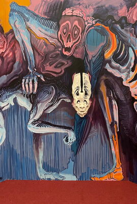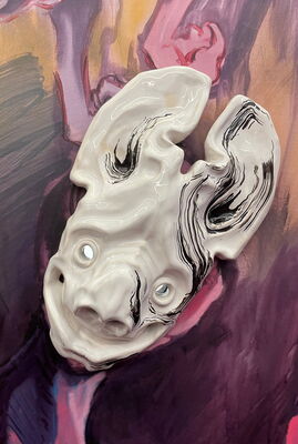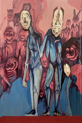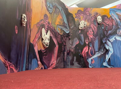 Die Anderen ist eine Rauminstallation, welche sich aus 8 bemalten Holzplatten, 17 Keramikmasken und einem Teppich zusammenfügt.