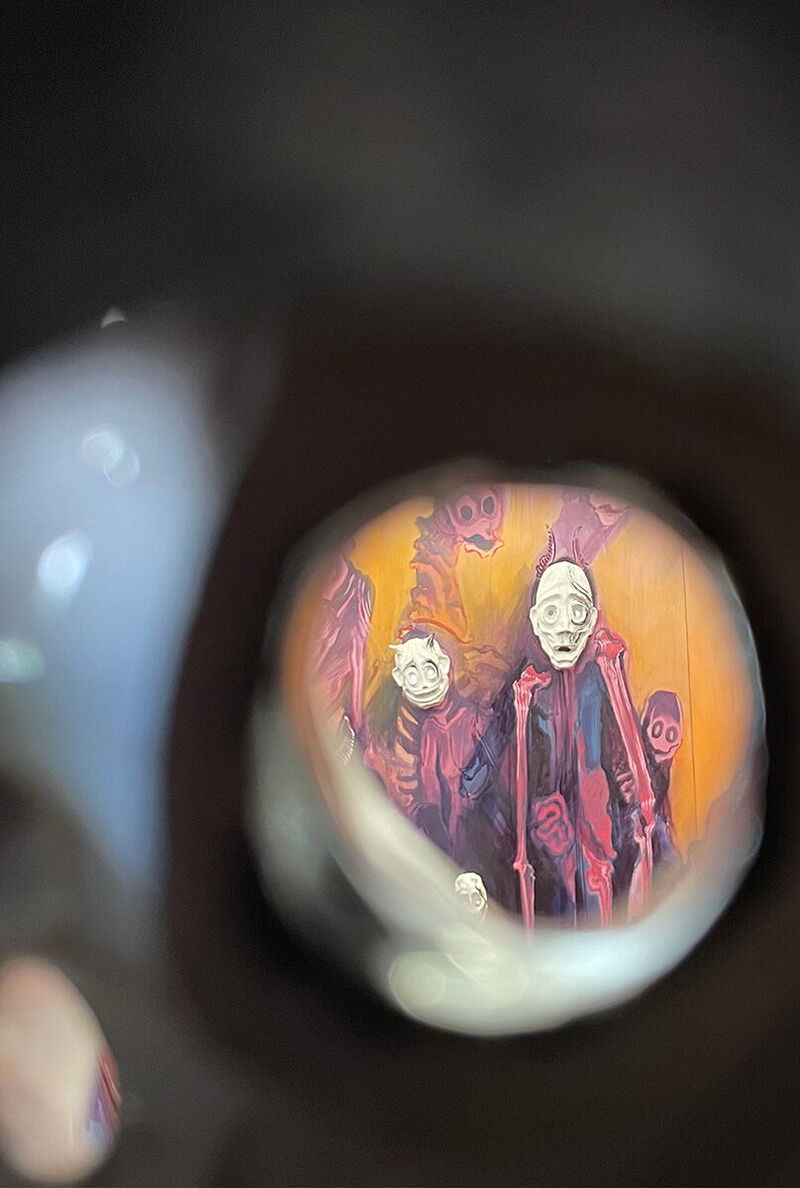 Durch Gucklöcher in den Holzplatten, welche sich direkt hinter den Augen der Keramikmasken befinden, erhält man Einblicke in das Innere der Arbeit. Das Blickfeld ist stark begrenzt, als würde man sich in einer Menschenmenge befinden und keine gänzlich freie Sicht erhalten. Die Besucher*innen befinden sich in einer beobachtenden und scheinbar anonymen Position.