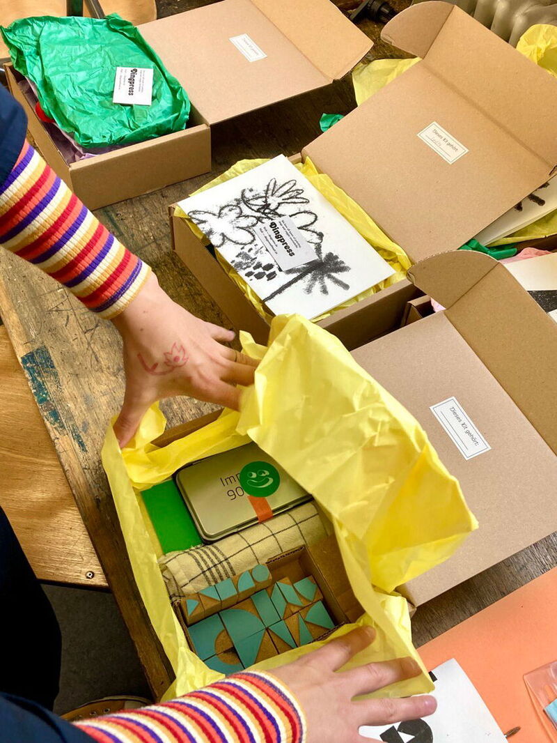 Die liebevoll produzierten Ding-Kits bringen interessierten Kinder und Erwachsenen das Druckhandwerk näher, in dem sie neben einer detaillierten und illustrierten Anleitung auch Inspiration, Werkzeuge und alle weiteren Materialien enthalten, um die jeweilige Technik von zuhause aus autodidaktisch zu erlernen und umzusetzen.