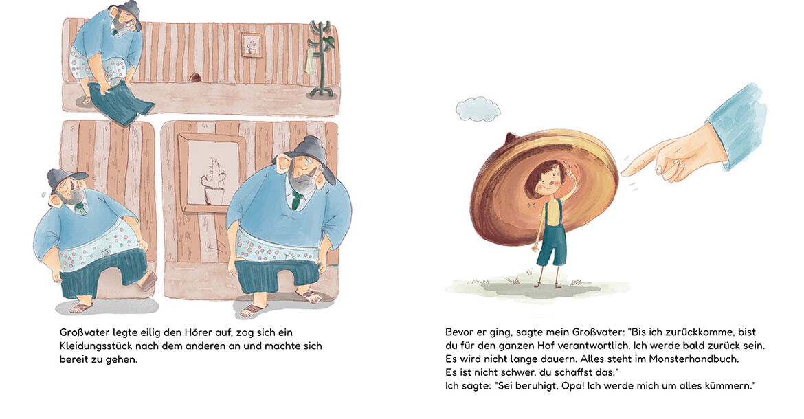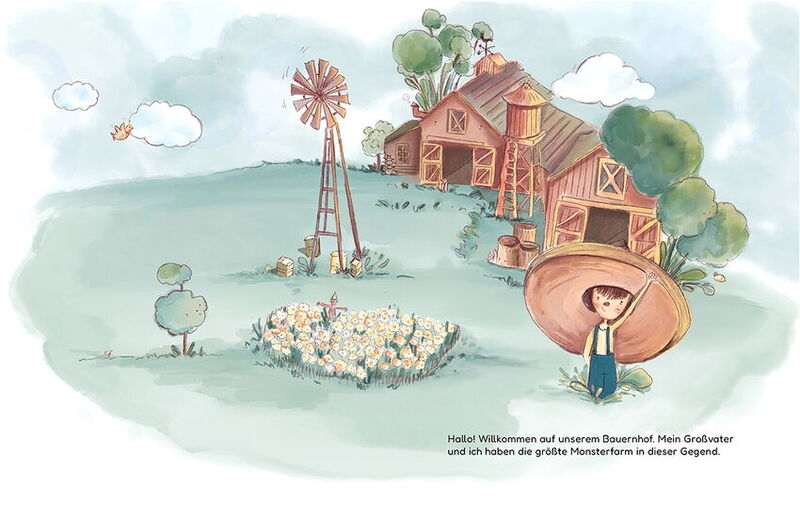 Meine Geschichte Ein Tag voller Monster erzählt von einem Großvater und seinem Enkel. Sie züchten besondere und nützliche Monster in verschiedenen Größen – klein, groß und sehr groß. Eines Tages muss der Enkel, der normalerweise die kleinen Monster betreut, plötzlich die großen Monster pflegen und füttern. Zuerst denkt er, dass es einfach ist, aber dann hat er viele.