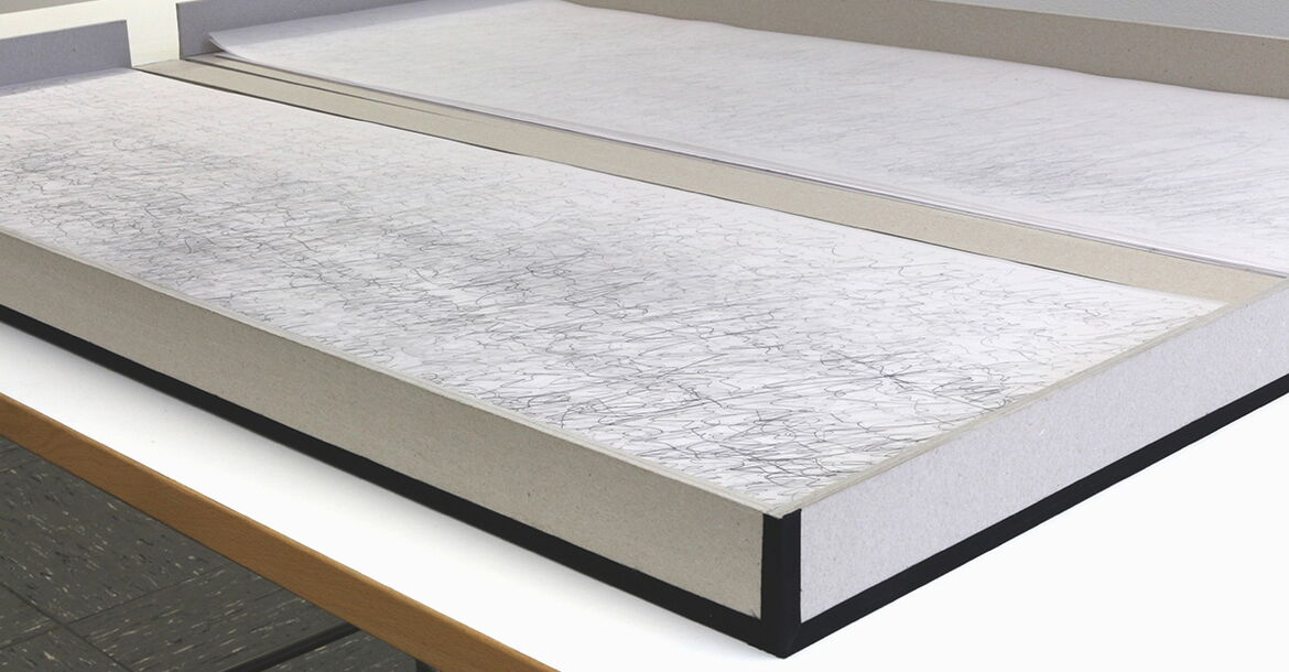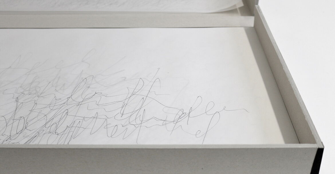 Während des Schreibprozesses entsteht ein automatisierter Schreibfluss, bei dem die Kontrolle über die Sinne mit der Zeit in meine Hand übergeht. Es entstehen lineare Gebilde, von denen einzelne Worte oder Buchstaben nur noch zu erahnen sind. In der Transparenz des Papiers lösen sich die schwarzen Wortstrukturen auf. Nur die oberen, beschriebenen Schichten bleiben sichtbar, während alles andere in der Tiefe verblasst und gleichzeitig den Betrachter festhält. Das Auge merkt, dass es ein Davor und ein Dahinter gibt. Ein irritierendes Sehen, da die einzelnen Schichten verschmelzen, ineinander übergehen. Es bleiben lineare Spuren, die wie gezeichnet wirken können. Beim Blättern der Seiten fangen die Linien an sich zu bewegen. Sie verschwinden und tauchen an anderer Stelle wieder auf.