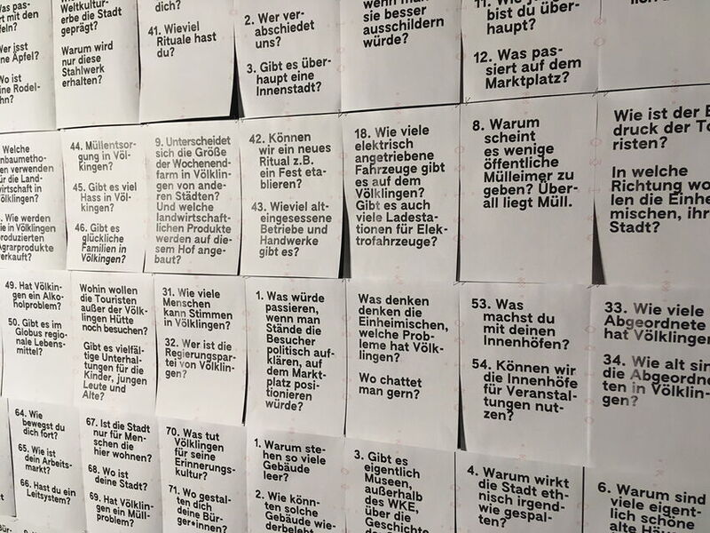 Wir suchten nach Potenzialen, stellten Fragen an Völklingen und entwarfen Visionen für die lokale Zukunft. Neben dem Spekulieren ging es auch um das Kommunizieren von noch nicht Gemachtem oder Gedachtem ... in einem Ausstellungssetting, einem Spaziergang, einem Film, einer Zeitschrift …