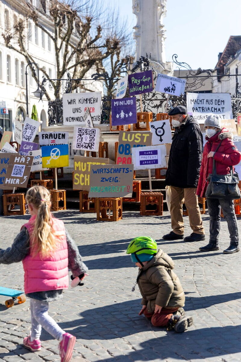 Dabei bediene ich mich verschiedenerer Formen der Kommunikation (öffentliche Aktionen/Performance, Objekte, Sticker und Parolen, eine informierende Website, ...). Der größte Teil meiner praktischen Arbeit war die Aktion Der undenkbare Streik, welche ich am 8. März 2022, dem Internationalen Frauentag, im Saarbrücker Stadtzentrum durchgeführt habe. Das Ziel hierbei war, ein Zeichen für mehr Wertschätzung und Respekt der unbezahlten, vor allem von Frauen vollbrachten, Care-Work zu schaffen.