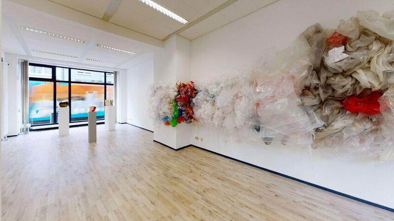 Die Wandinstallationen bestehen aus verschiedenen Plastikbeuteln. Die unterschiedlichen Kunststoffe sind zu einer irrealen, konstruierten Landschaft verknüpft und bilden geologische Erdstufungen nach. Die künstliche Landschaftsformation spiegelt zugleich unseren heutigen Lebensstil: Wir bedecken unsere Erde mit einer Plastikschicht.