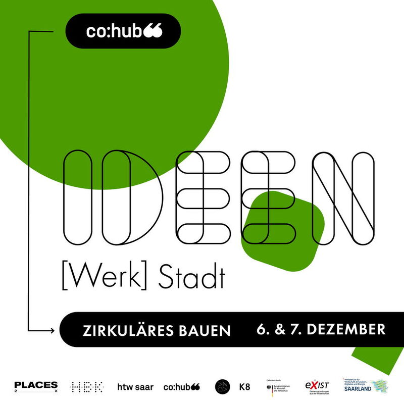 Die "Ideen[Werk]Stadt 3 - Zirkuläres Bauen" ist eine Veranstaltung der Gründungsberatung places2x der Hochschule der Bildenden Künste des Saarlandes (HBKsaar) und der Hochschule für Technik und Wirtschaft des Saarlandes (htw saar) in Kooperation mit dem co:hub66 und K8 Institut für strategische Ästhetik im Kontext des Saarländischen Staatspreises für Design 2023 und des Nachwuchspreises Architektur 2023.