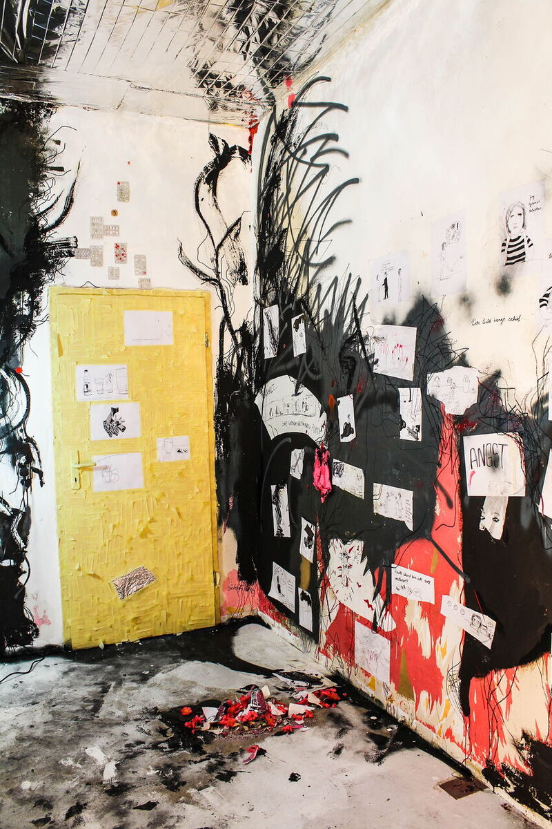 Eine cartoonhaft narrative Ebene trifft gemeinsam mit reinen Texten und Zeichnungen auf die Ebene einer eher intuitiv wahrnehmbaren, durch Eingriffe in den Raum nonverbal ästhetisch vermittelten Stimmung und erahnbarer Gefühlsinhalte. Die Ebene der Rauminstallation wird so von der durch das Comic geprägten graphischen Ebene überschrieben. Das Comic, die Zeichnungen und Schriften selbst, werden auf den Raum ausgedehnt und somit für den Rezipienten begehbar.