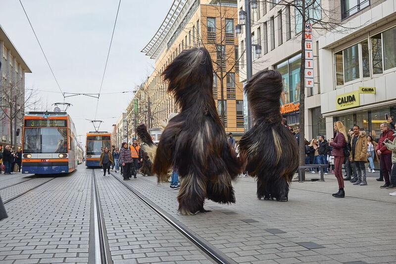 Vom Paradeplatz der Innenstadt Mannheims führt die Parade mit Masken der Kukeri-Tanzgruppe aus Eleshnitsa (Region Bansko, Bulgarien), drei Musiker*innen, Performer*innen und ca. 1000 Personen durch die Stadt in die Kunsthalle Mannheim.