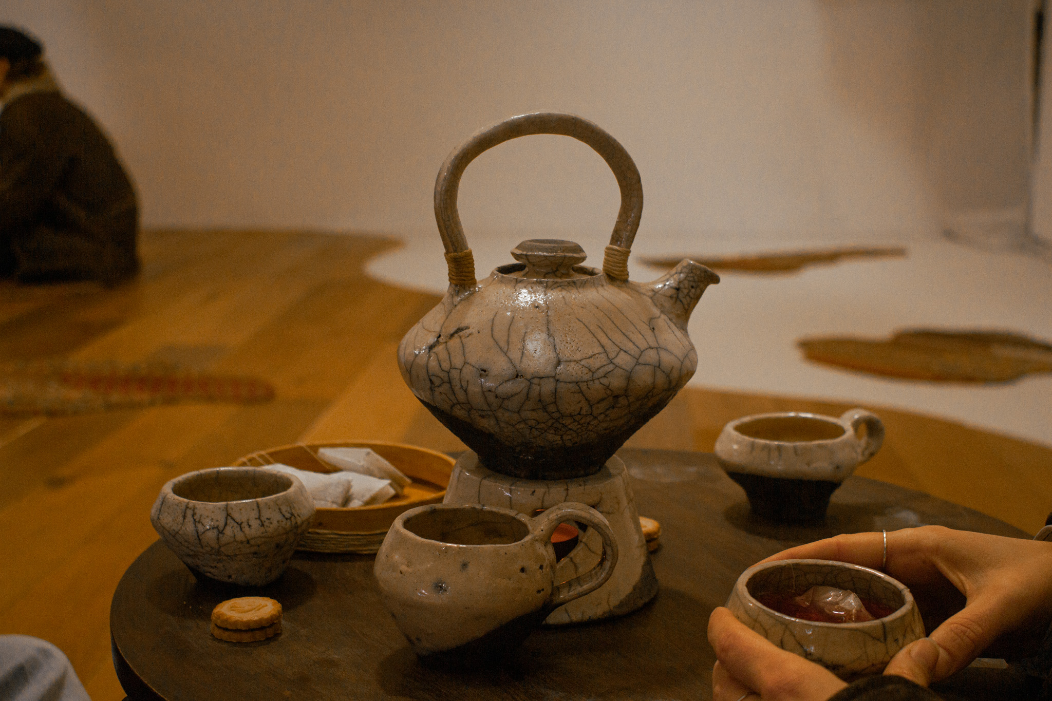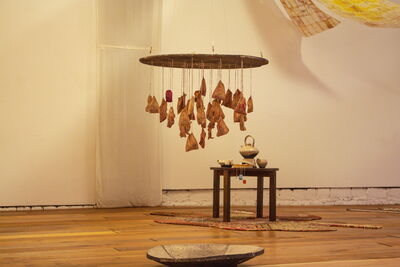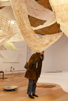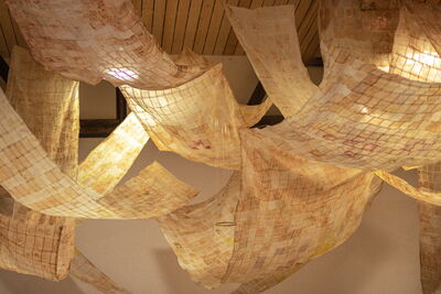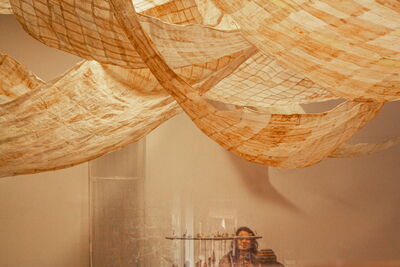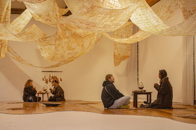 Die Installation bestand aus zehn Bahnen aneinander genähtem Teebeutelpapier, verstärkt mit Draht und in unterschiedlichen Höhen hängend. Darunter luden zusammengesetzte Teppiche und Holztische mit handgefertigten Keramiken zum Verweilen ein. Besucher konnten Tee trinken und die benutzten Beutel in eine Keramikscheibe einfädeln, die in der Mitte des Raumes schwebte.