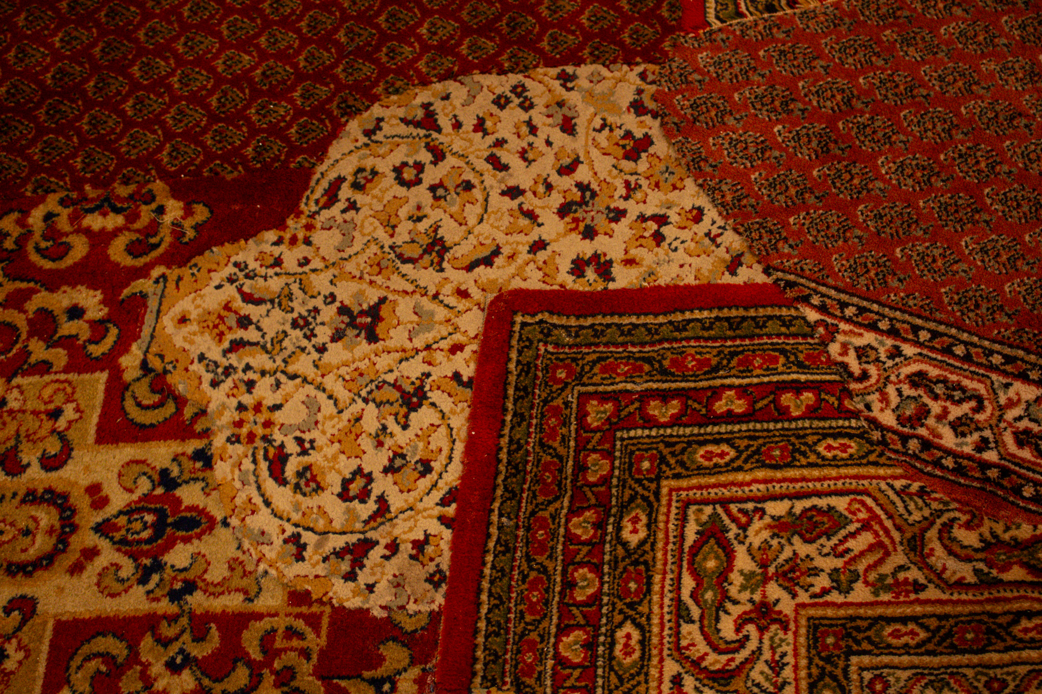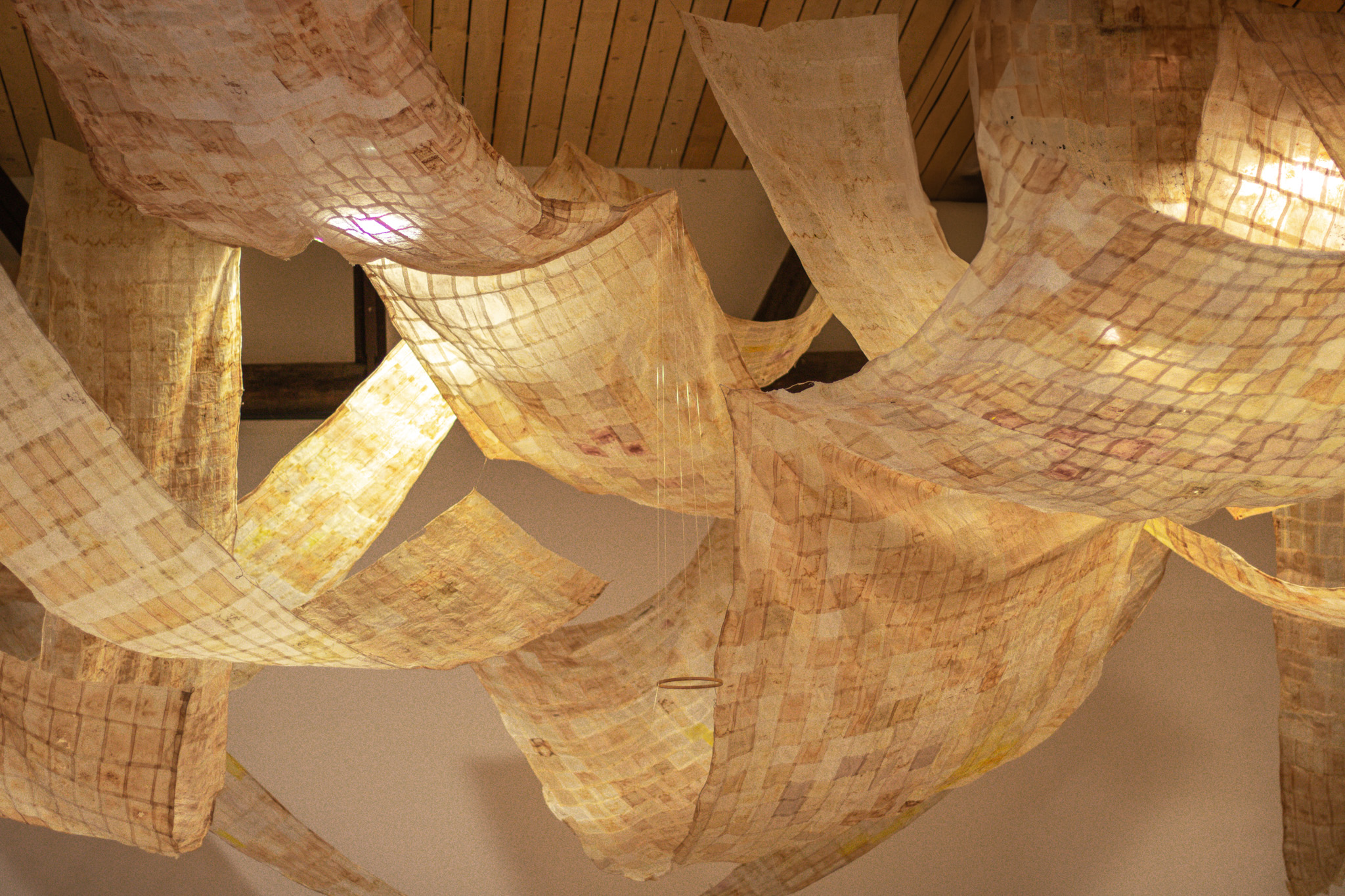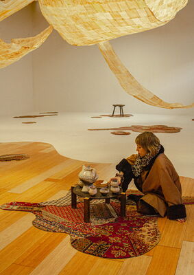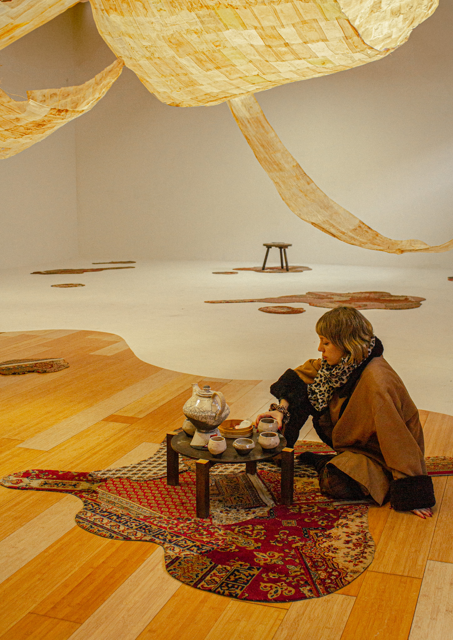 Der Raum war zweigeteilt. Über zwei Drittel ergießt sich ein wellenförmig zugeschnittener Holzboden, durchsetzt mit organisch geformten, fragmentierten Teppichinseln, die eine warme, einladende Atmosphäre schufen. Darüber schwebten Bahnen aus Teebeuteln. Der angrenzende weiße Bereich wirkte ruhiger, fast zurückhaltend, und bot Raum für Rückzug. Besucher sind eingeladen beim Betreten die Schuhe auszuziehen. Die beiden Seiten bedingen einander und bieten einen Ausgleich.