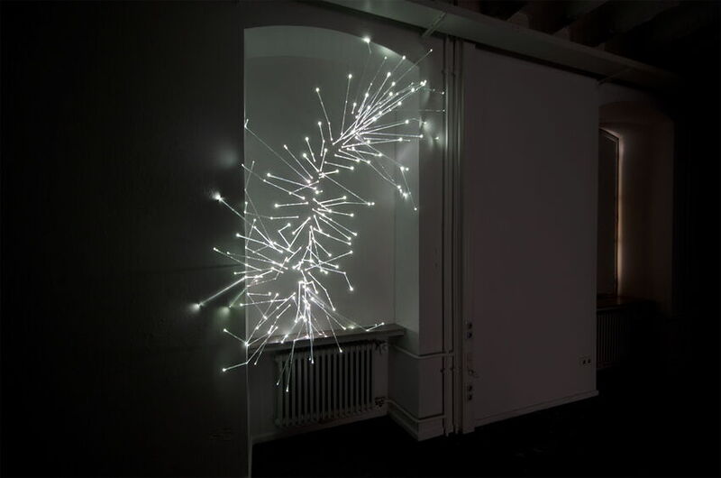 Die Installation Raumperforation Var.3 i.V.m. Tagesslicht zeigt eine verdunkelte Fensternische, durch die eingeschobene und verformte Glasstäbe als Lichtleiter fungieren. Das Außenlicht wird in Form eines auslaufenden Strahlenbündels in den Innenraum geleitet.