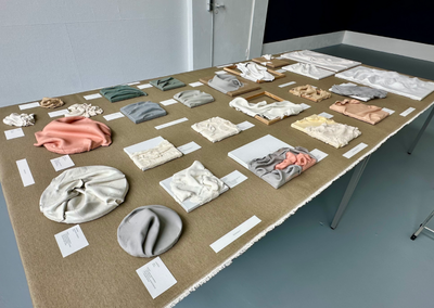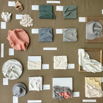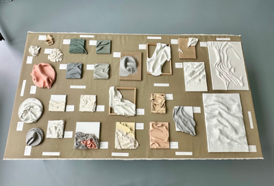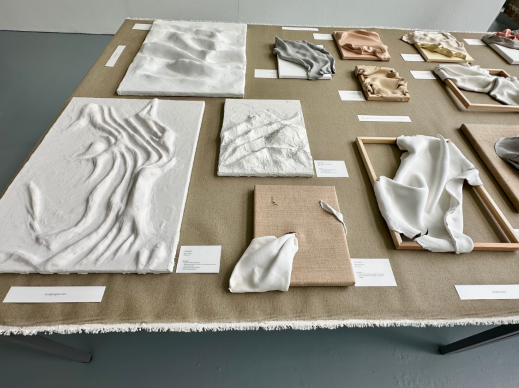 Die Sammelstudie von drapierten Leinwänden ist ein empirisches Archiv an Samples, das die Grenzen nichttextiler Materialien auf innovative Weise erkundet. Bestehend aus einer Vielzahl von Versuchsobjekten, stellt diese Studie eine umfassende Untersuchung der Eigenschaften und Möglichkeiten von Gips, Beton, Salzteig, Kaltporzellan und Modelliermasse dar.