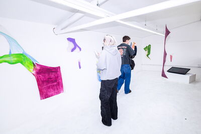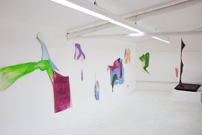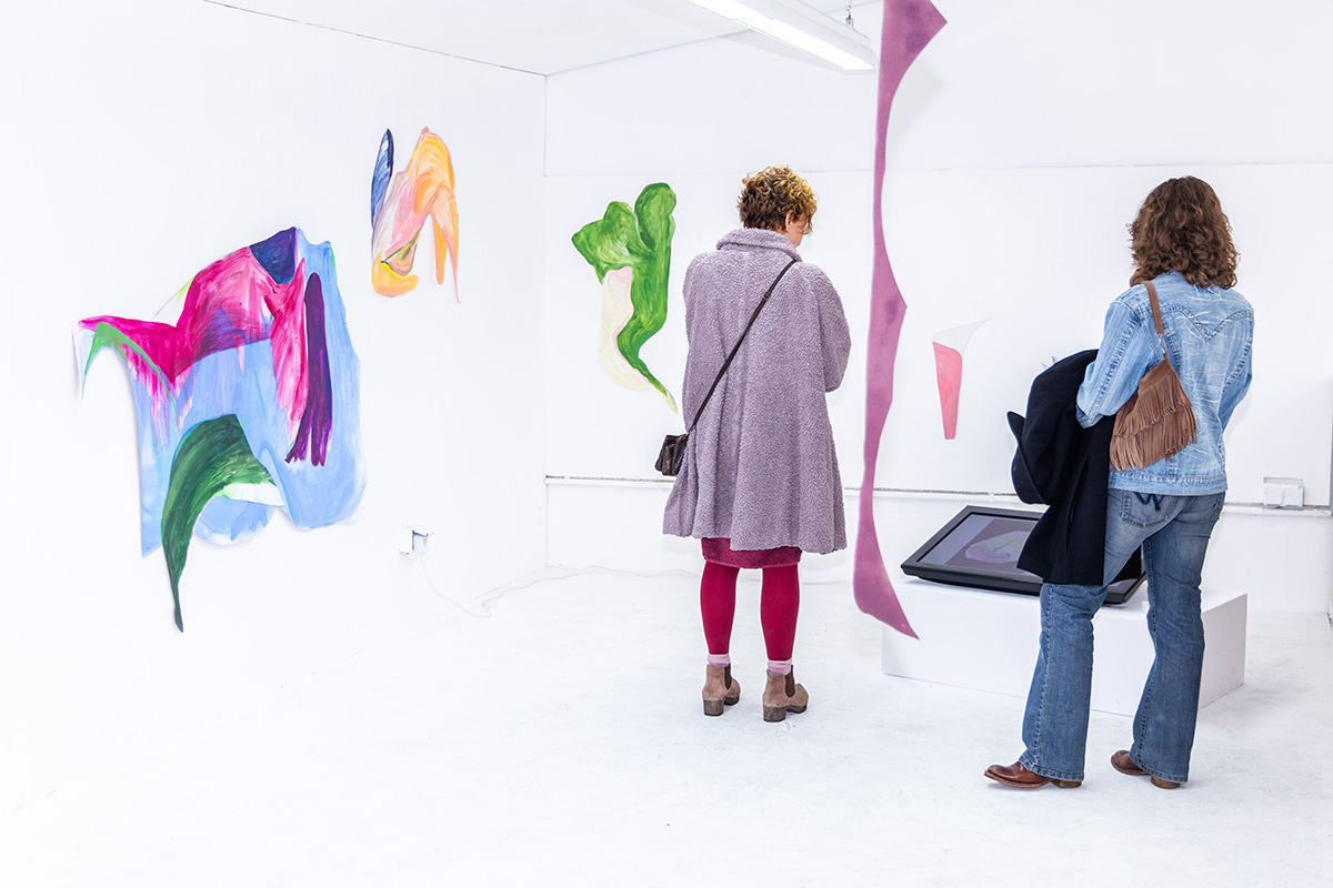 Meine Arbeiten sind keine gesamtheitlichen Malereien, die eckig eingerahmt werden sollen. Jedes Bildelement bringt seinen eigenen Zustand und seine eigene Geschichte mit sich. Deshalb schaue ich mir den Raum vor Ort an, entwickle eine passende Geschichte, die zum Raum passt, und überlege, wie ich die einzelnen Bruchstücke platzieren kann. Der Installationsprozess ist dabei genau derselbe wie der Malprozess.