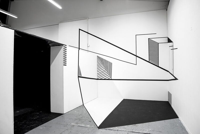 Wie ein kraftvolles, gigantisches Netz legen sich Linien, Flächen und deren vielfältige Schatten über Fenster, Boden und Wände. Die baulichen Gegebenheiten des Ortes werden nicht als Begrenzungen der Präsentationsfläche verstanden – sie werden zu Anhaltspunkten für Verfremdung und Verknüpfung oder scheinen ganz zu verschwinden. Der teils kontrollierte und präzise, aber auch teils intuitive und spielerische Einsatz unterschiedlicher Materialien im Raum treibt diverse Spiele mit Lichteinfall, Perspektive und räumlicher Wahrnehmung. Das Erscheinungsbild des Raumes wird gesprengt und durch verschiedenste Eingriffe neu definiert.