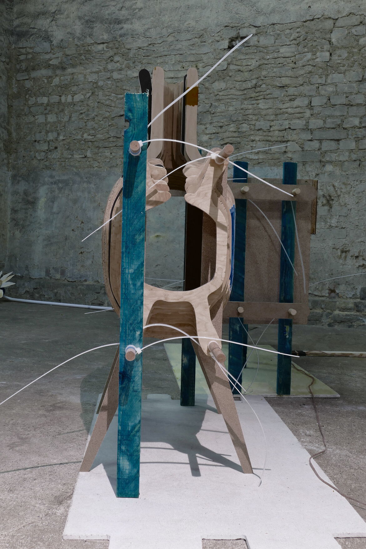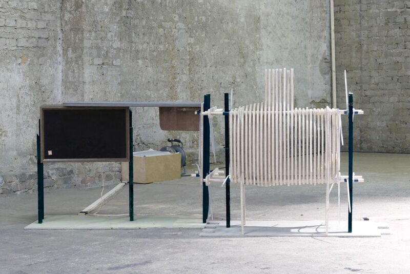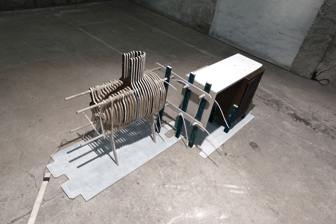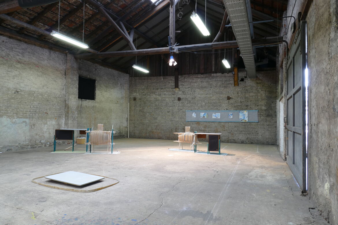 Der Ausstellungsraum der ehemaligen Industriehalle wird durch die Klangskulpturen bestimmt. Daneben gibt es eine sitzhohe Bühne von ca. 6 m² sowie eine Wand mit Zeichnungen und eine Abbildung von Skizzen zum Stereo-Möbel.