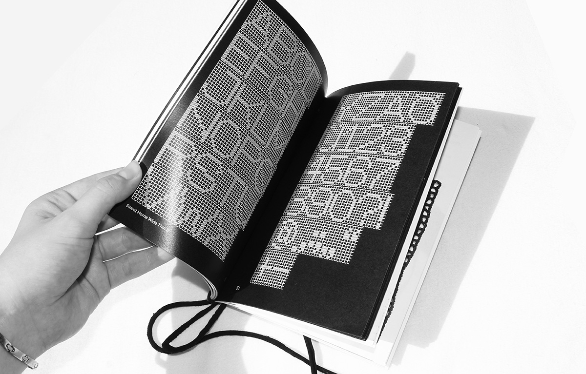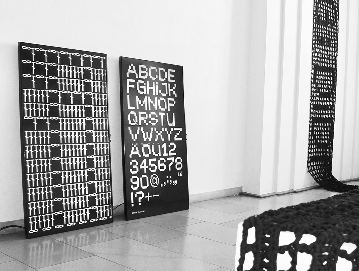 Bei der Technik des Filethäkelns wird durch unterschiedliche Maschenabfolgen eine rasterhafte und netzartige Struktur hergestellt, in die dann Motive und Buchstaben eingearbeitet werden können. Die Typografie im Kontext traditioneller Häkelarbeiten ähnelt somit – der Technik geschuldet – modernen pixelbasierten Schriften. Mein Konzept wird durch die Verknüpfung von Schriftgestaltung mit digitalen Tools und der ländlich geprägten Handarbeit definiert. Dabei wird die Handarbeitstechnik neu kontextualisiert. Traditionelle Filethäkeleien sind üblicherweise sehr kleinteilig, fragil und meist mit weißem, dünnem Garn angefertigt worden. Zwar orientierte ich mich stilistisch und technisch an diesen Merkmalen der klassischen Handarbeit, habe aber gleichzeitig den Bezug zum modernen Kommunikationsdesign hergestellt. Dies geschah durch den Einfluss pixelbasierter Fonts, die in der Designwelt seit Anbeginn der Computererfindung und der Entwicklung digitaler Technologien immerzu eine bedeutende Rolle spielen. Auf einer eigens gestalteten Pixelschrift basierend, habe ich einen Font namens Sweet Home mit verschiedenen Schriftschnitten ausgearbeitet, den man nicht nur in digitalen und Print-Anwendungen einsetzen kann, sondern der gleichzeitig als Häkelanleitung funktioniert. Das bedeutet, dass die Schriftzeichen aus den Symbolen für Stäbchen und Luftmaschen bestehen und somit anzeigen, in welcher Reihenfolge die Maschen gehäkelt werden müssen, um Buchstaben anzufertigen. Die Fonts bieten also sowohl analoge als auch digitale Gestaltungs- und Anwendungsmöglichkeiten und zeigen eine moderne Herangehensweise an das traditionelle Filethäkeln.