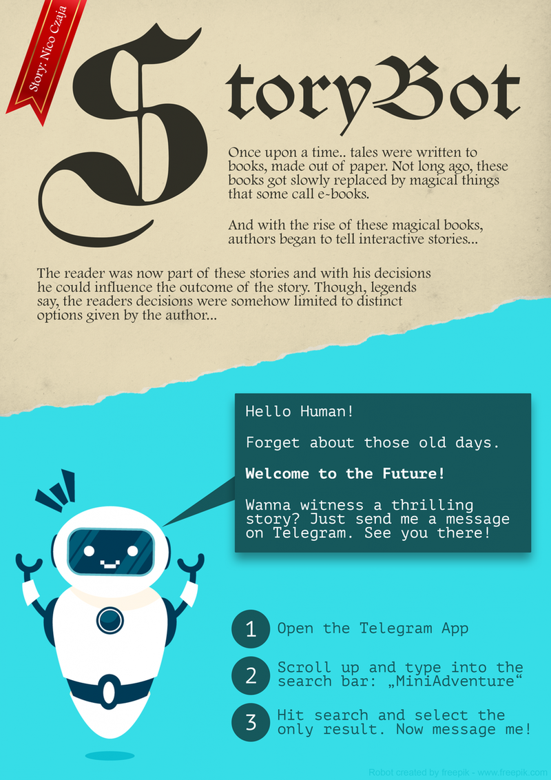 Das StoryBot-Projekt bringt Autoren von interaktiven Geschichten und modernste Chatbot-Frameworks zusammen. Mit den in diesem Projekt entwickelten Tools, können Autoren Chatbots ohne jegliche Programmiererfahrung erstellen, die Nutzern interaktive Geschichten in einer natürlichen Unterhaltung erzählen. Solche Unterhaltungen können in privaten Chats ablaufen, in denen sich Nutzer mit dem Bot über Telegram oder Facebook unterhalten und mit ihren natürlichsprachlichen Antworten (im Gegensatz zu vordefinierten Antwort-Blasen) den Verlauf der Geschichte beeinflussen können.
