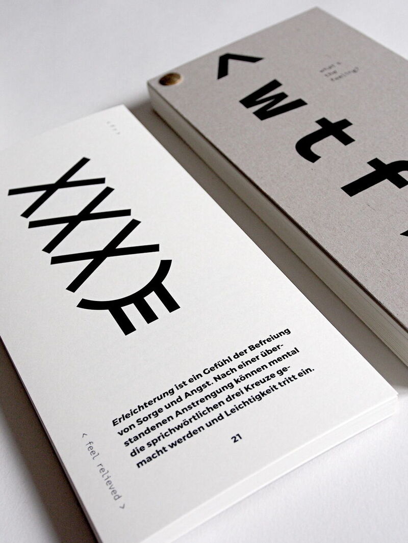 Während meiner Recherche viel mir auf, dass es für mich und für viele andere, die sich täglich im kreativen Schaffensprozess befinden, nur bedingt möglich ist, typische Emotionen, Handlungen und Stimmungen während eines kreativen Prozesses bildlich darzustellen und durch eine einfache, visuelle Form mit anderen zu teilen. Daher entwickelte ich im Rahmen meiner Diplomarbeit eine neue Form und Serie ideografischer Emoji. Diese beinhaltet thematisch die Phasen, Zustände und Emotionen kreativ tätiger Menschen während ihres Schaffensprozesses: Die < w t f > What’ s the feeling? - Serie.