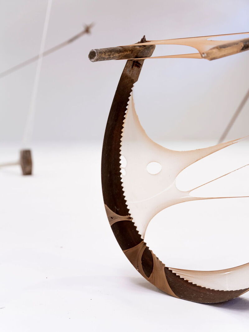 Durch das Zusammenfügen der beiden Materialien wird Spannung erzeugt. Die Spannung verstärkt wiederum die Leichtigkeit und Fragilität des Strumpfs, seine Fähigkeit zu fangen, das destruktive Potenzial der alten Werkzeuge und ihre kämpferischen Geschichten.