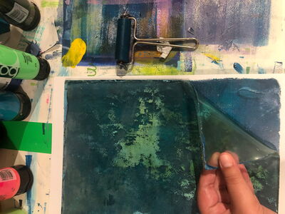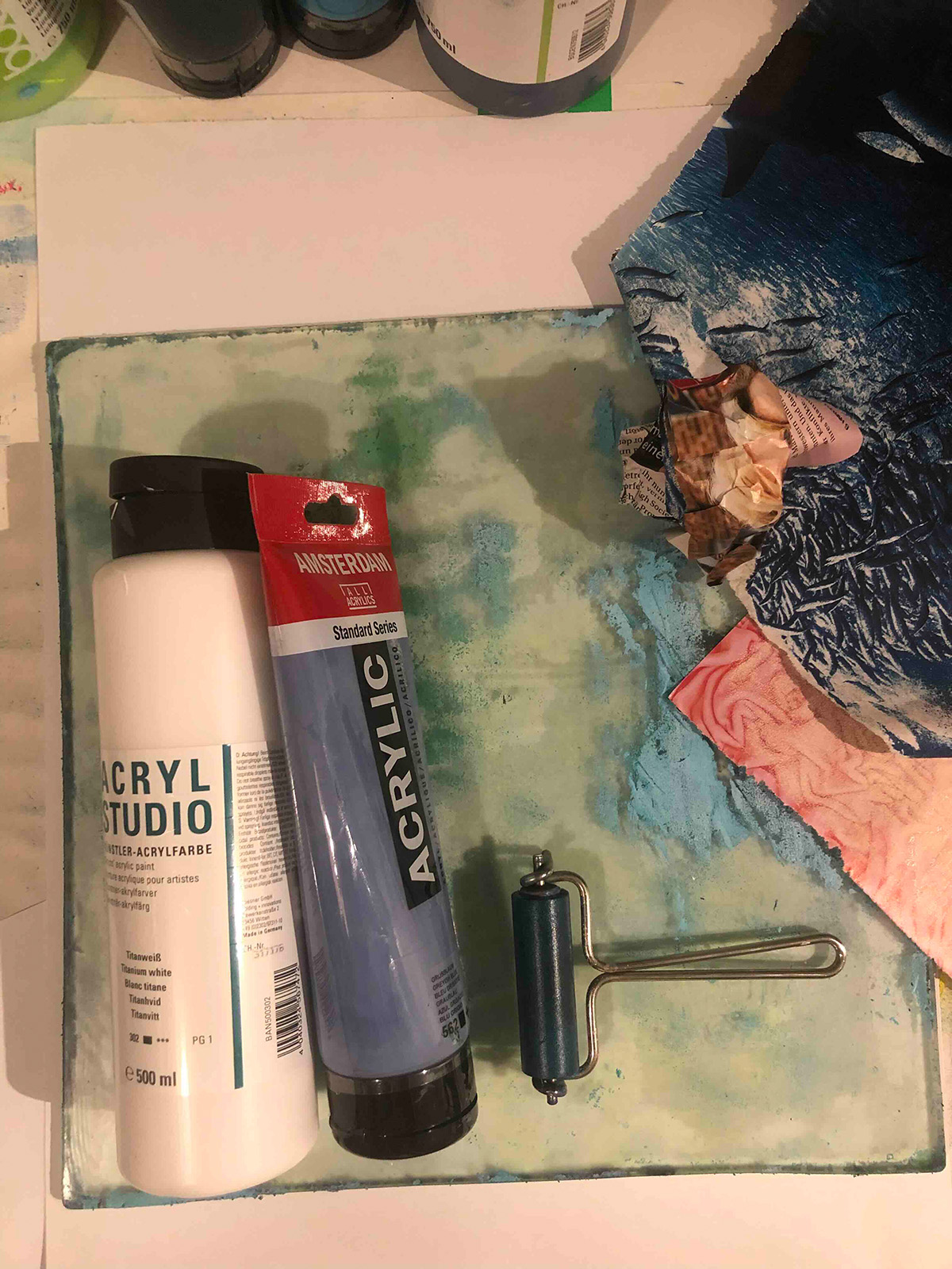 Mit Hilfe der Drucktechnik können auch Magazinseiten auf die Gelplatte übertragen werden. In einer eher abstrakten Form der Monotypie zeige ich verschiedene unverzichtbare Bereiche von Wasser auf unserem Planeten, die auf verschiedene Weise interpretiert werden können. Die Kunstdrucke sollen auch Gefühle vermitteln, die möglicherweise Erinnerungen an den Geruch von Meerwasser oder Sommerregen wecken. Mit Hilfe dieser Arbeit ist mir nochmal viel bewusster geworden, wie wichtig es ist, Wasser zu schätzen und sparsam damit umzugehen. Es ist unser Lebenselixier, Hoffnungsträger, Entspannungsoase und so vieles mehr.
