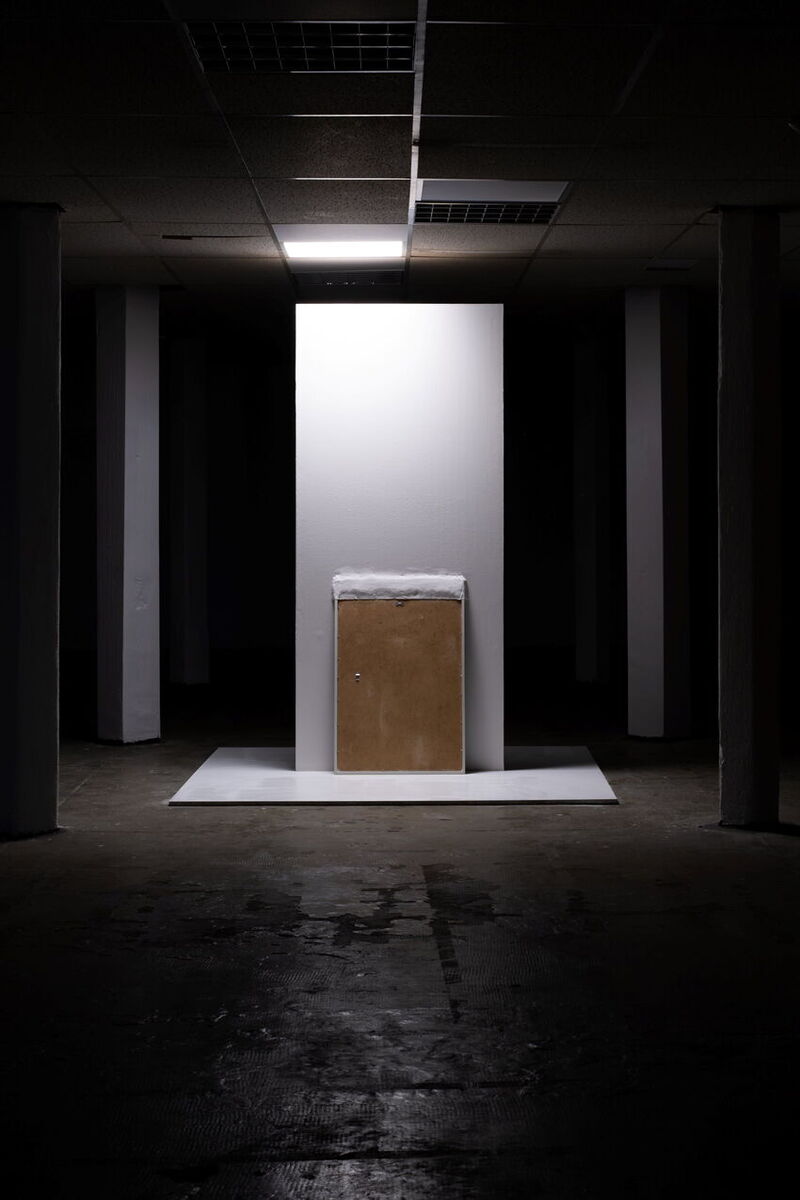 Beim Öffnen der Tür und dem Betreten des Raumes sich in einem halbdunklen, mit verwinkelten Wänden und einem abgelaufenen Fußboden wiederfindend, wirkt dieser im ersten Moment eher ungewöhnlich für einen Ausstellungsort. Kein perfekter Boden, glatte Wände und mit Licht erfüllter Raum. Die einzige Lichtquelle leitet an der Vielzahl von Säulen vorbei, bis in das Zentrum. Dort eine einzelne weiße Wand auf einem weißen Boden freistehend im Raum platziert. In dem Ausschnitt eines Raumes ist ein Bilderrahmen mit der Bildseite in einem bestimmten Winkel gegen die Wand gelehnt, wobei der obere Teil des Rahmens mit der Wand fest verbunden ist und nicht mehr bewegt werden kann. Das Betrachten des Bildes im Inneren des Rahmens wird somit nicht möglich. Ein kleiner Spalt zwischen Rahmen und Wand lässt nur vermuten.