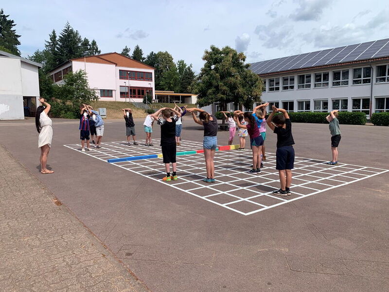 Im Rahmen des Abschlussprojektes „XXL Raster“ wurden Schulhöfe sowie ein Schulfoyer mit einem Raster aus quadratischen Kästchen versehen. Die Idee des Projektes war, „eine begehbare Seite eines Schulheftes auf den Schulhof zu projizieren“ (1), um so den Schüler*innen eine neue Lernumgebung zu gestalten, die als individuell nutzbare Lernräume fungiert. Die Umsetzung erfolgte an drei Schulen mit unterschiedlichen Schulformen: einem Gymnasium, einer Gemeinschaftsschule sowie einer Grundschule.