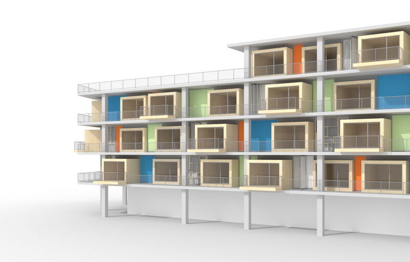 Durch die Skelettbauweise des Kaufhauses wird eine flexible Raumunterteilung ermöglicht und es kann auf sich verändernde Nutzungsanforderungen reagiert werden. Die Trennung der privaten Wohnräume von den gemeinschaftlich genutzten Flächen erfolgt durch den Einsatz von Privatraummodulen aus Holz. Somit wird der Charme und die Größe der ursprünglichen Struktur bewahrt, und es entstehen spannende Zwischenräume zwischen den Privatraummodulen. Die Privatraummodule sind an der Fassade angeordnet, beziehungsweise werden diese in die neue Fassade integriert. Durch unterschiedliche Fassadenelemente und den modularen Aufbau werden verschiedene Nutzungen und Größen der Zwischenräume ermöglicht. Das Fassadensystem kann zudem an verschiedene Grundrisse und wechselnde Anforderungen angepasst werden und ist somit auch für die Umnutzung anderer Kaufhausgebäude geeignet.