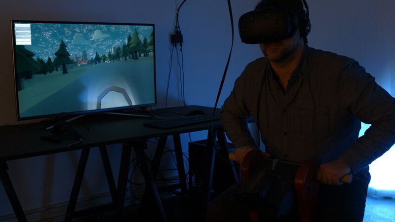 The spring riders position and orientation are captured using a Vive controller attached to its front. This data is then used to accelerate and steer the virtual motorcycle ingame.