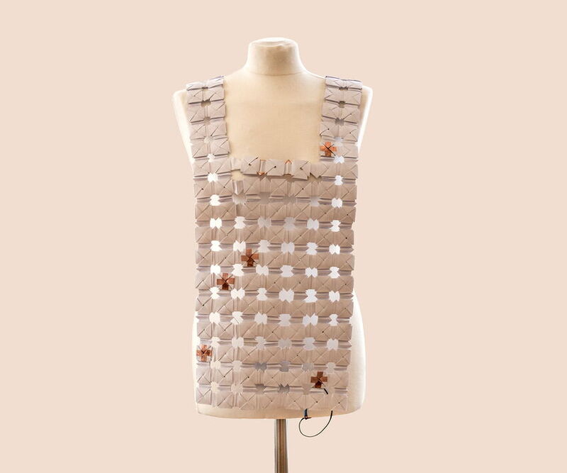 Das 'Tangrami-Kleid' ist ein Kommunikationskanal, um das Interagieren einfacher und/ oder interessanter zu gestalten. Dieses ‘Kanal’ besteht aus vielen kleinen Papierdreiecken, die ineinander gesteckt werden können. Der Benutzer kann Form und Funktion des Projektes durch hinzufügen/ herausnehmen der Papierteilchen selbst bestimmen. Durch das Berühren spezifischer Teile löst der Betrachter Signale, wie z. B. Klang oder Licht, aus. Durch die Berührungen entstehen auch ungewohnte Körperbewegungen, die wiederum die Neugierde der Konversationspartner wecken. Man fühlt sich durch diese Schutzschicht extrovertierter, ohne es zu sein. Denn sämtlicher Klang/Text, kann auch einfach vorher aufgenommen worden sein. Man braucht nicht zu sprechen und spricht doch.